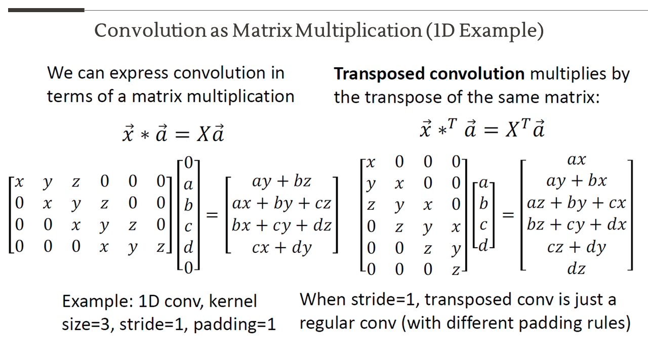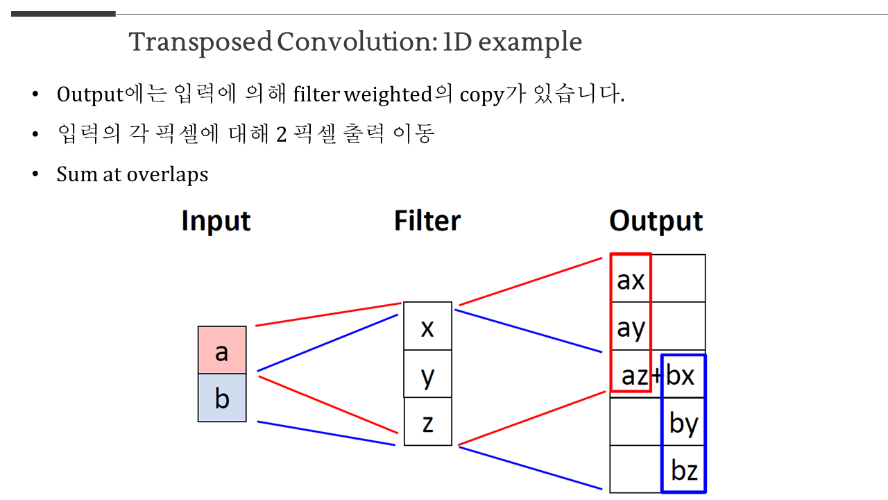 더 구체적인 예시를 살펴보면, 1차원에서 3x1 Transpose convolution을 수행합니다. 필터에는 $x, y, z$가 있고 $a, b$를 입력 받습니다. output을 보면 입력값이 가중치처럼 쓰이며 필터에 곱해집니다. 그리고 이 값을 출력에 넣고 더해줍니다.