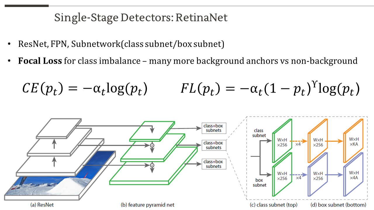 첫 번째로 RetinaNet입니다. 아까 앞에서 보았던 FPN의 구조가 들어가 있습니다. RetinaNet 저자의 목표는 Convnet feature 계층 구조의 피라미드 모양을 자연스럽게 활용하면서 모든 규모에서 강력한 의미를 갖는 feature pyramid를 만드는 것이었습니다. 그리고 Focal Loss를 설계하여 object와 background가 이루는 class imbalance 문제를 해결하려 하였습니다.