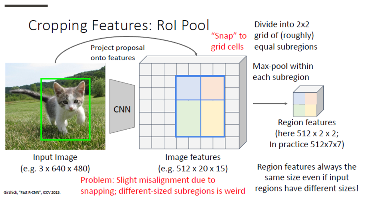 다시 한 번 편의를 위해  RoI 풀링 레이어의 크기를 선택할 것이지만 크기가 다를 수 있습니다. RoI 풀링은 왜 적용할까요? RoI 풀링 레이어 다음에는 크기가 고정된 FC 레이어 가 있습니다. RoI의 크기가 다르기 때문에 동일한 크기로 풀링해야 합니다. 여기선 512 * 2 * 2으로 풀링해야 합니다. 위 이미지에서 RoI 크기를 알 순 없지만 이를 딱봐도 2 * 2 크기로 나눌 수 없다는 것을 또 짐작할 수 있습니다.